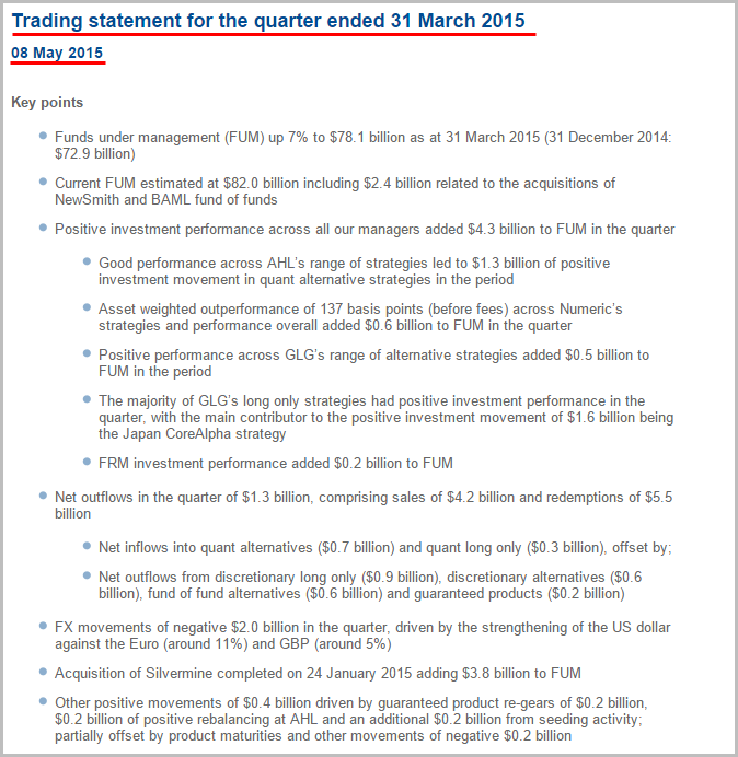 On May 8th 2015, Man Group released its Trading Statement for the First Quarter. The main summary is shown below…